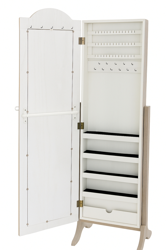 - 2 u 1 dizajn – veliko stojeće zrcalo + skriveni ormarić za nakit