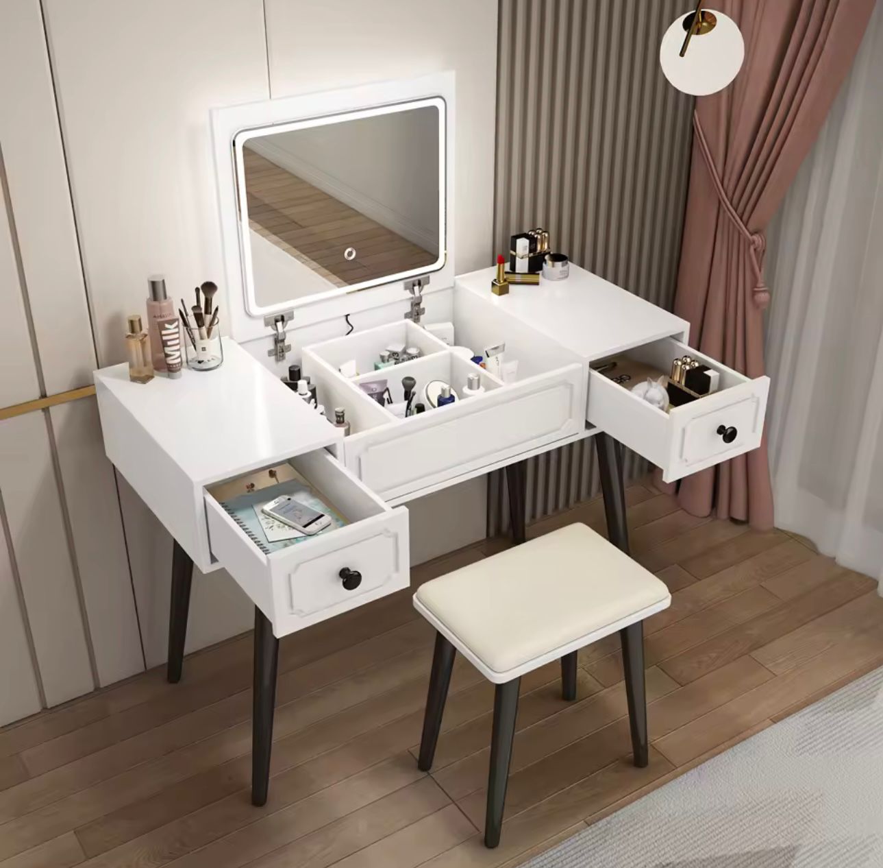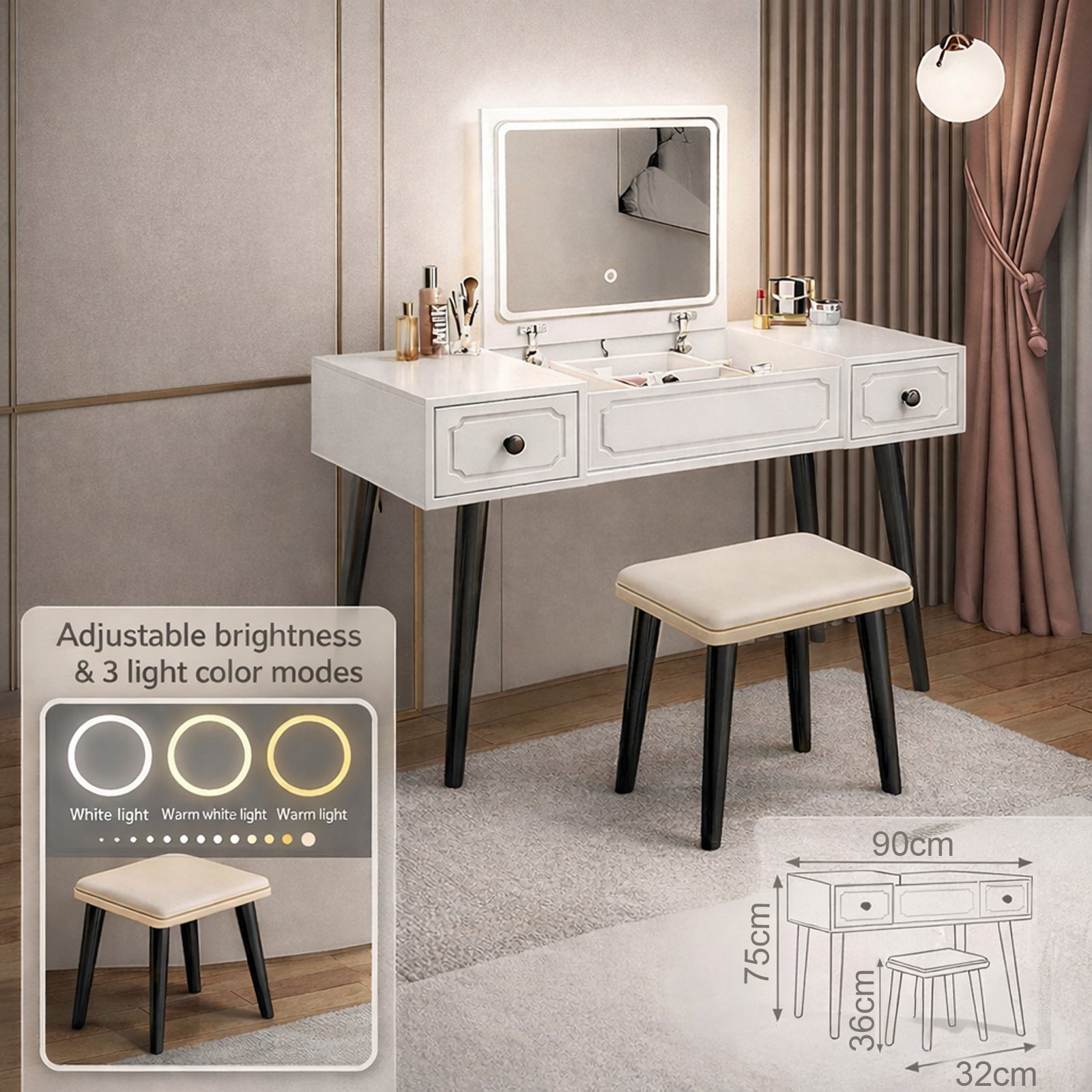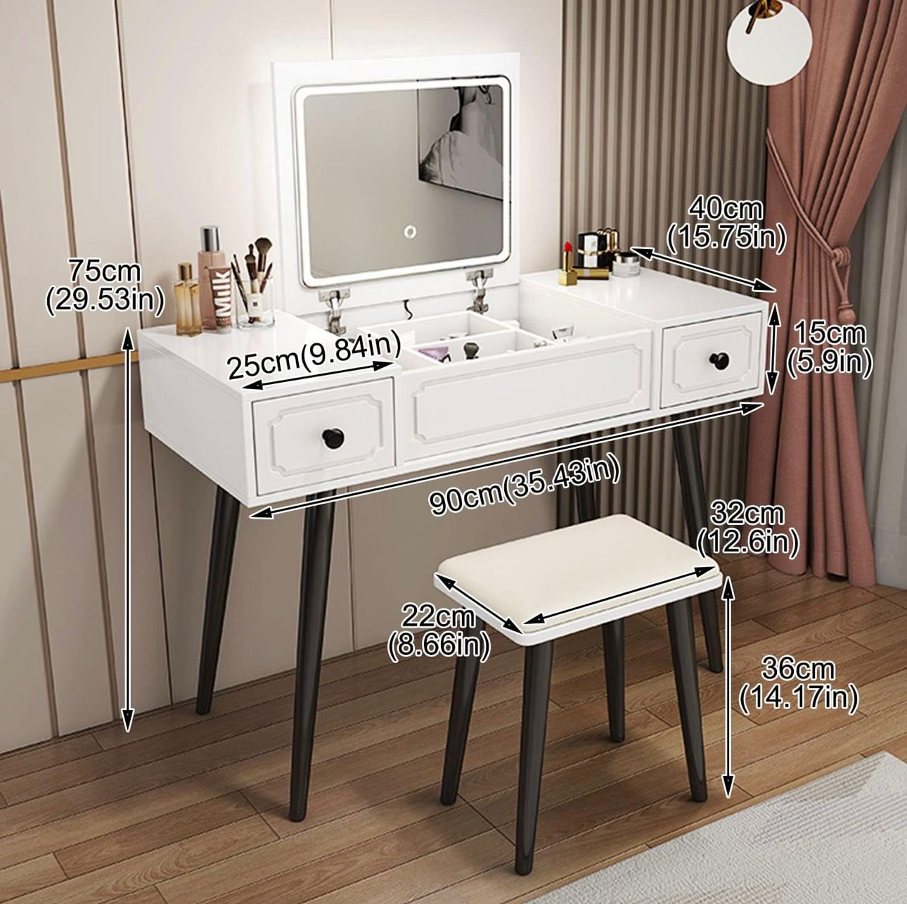 Podesiva rasvjeta · 3 načina svjetlaElegantni stol za šminkanje s integriranim LED ogledalom, praktičnim pretincima i udobnom stolicom – sve što je potrebno za uređen, moderan beauty kutak.