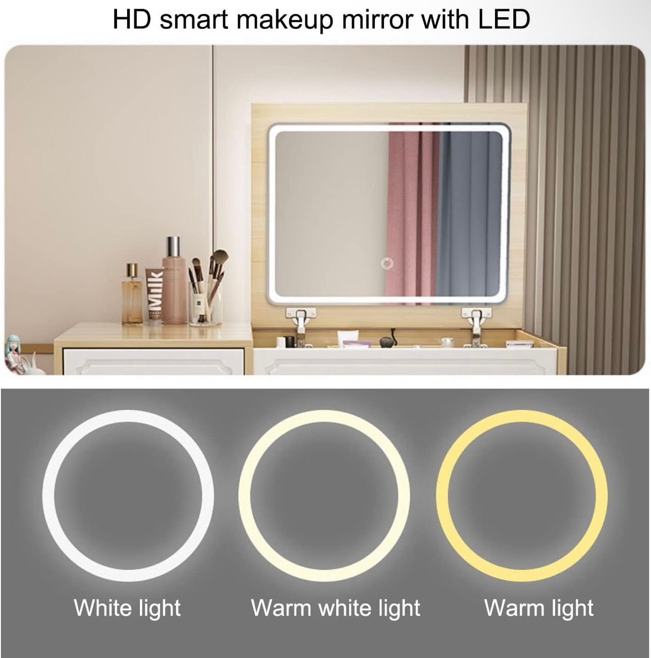 LED rasvjeta oko ogledala nudi tri načina svjetla: bijelo svjetlo, toplo bijelo i toplo svjetlo, uz mogućnost finog podešavanja jačine. Jednim dodirom na tipku na ogledalu bira se idealno osvjetljenje za šminkanje u svako doba dana.