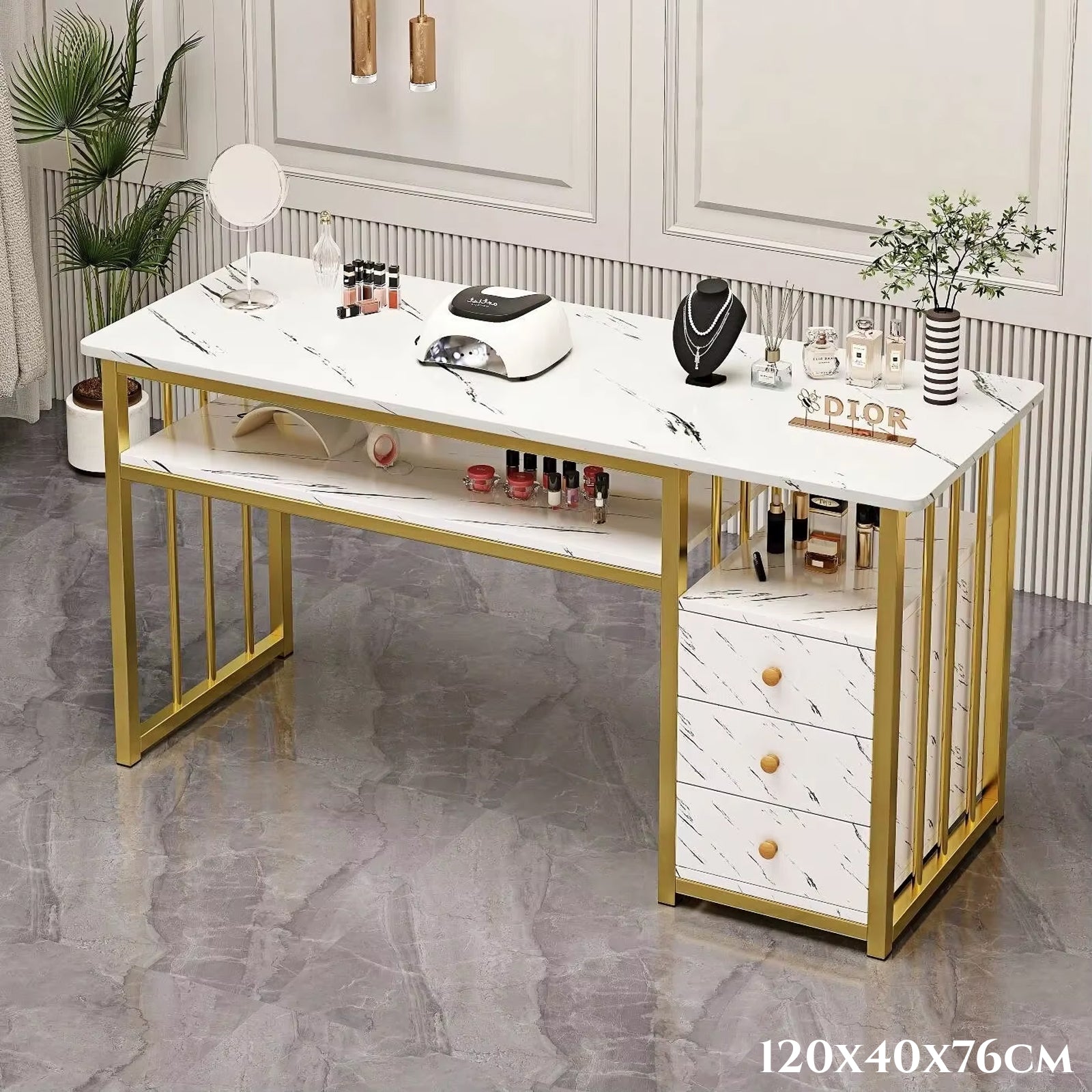 Elegantni make-up stol sa zlatnim detaljima i mramornom površinom – idealan za salone i kućni beauty kutak.