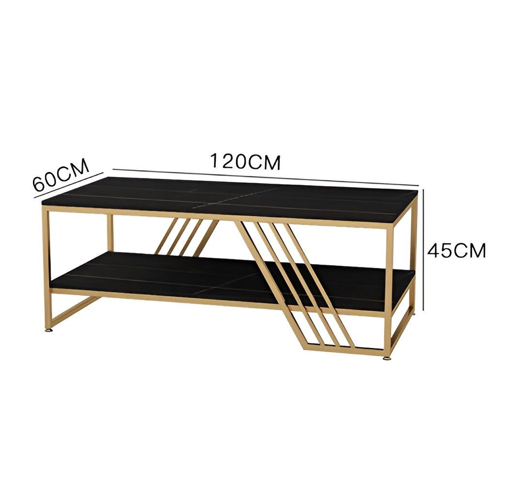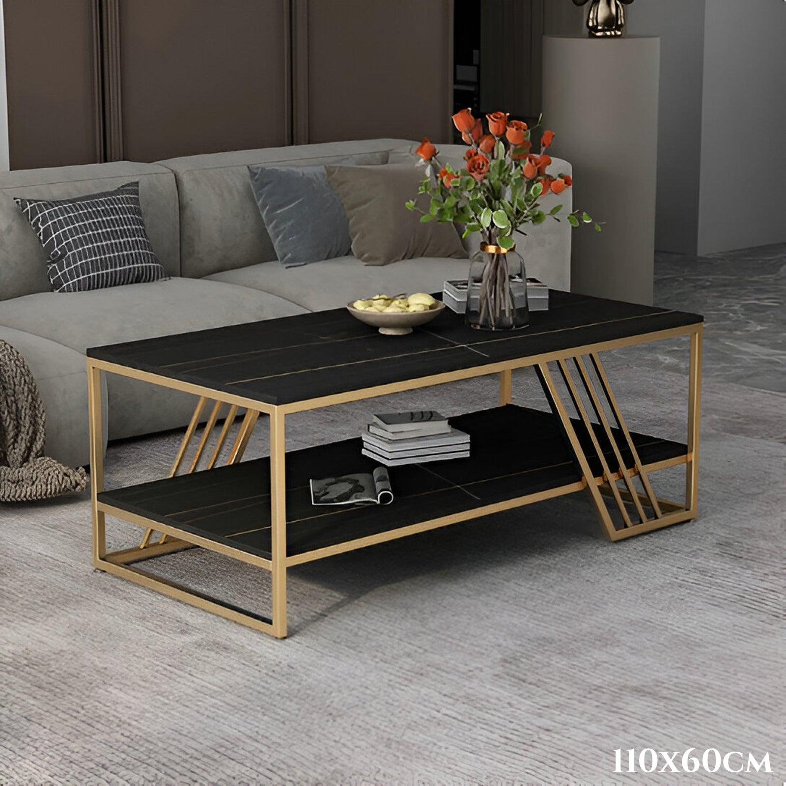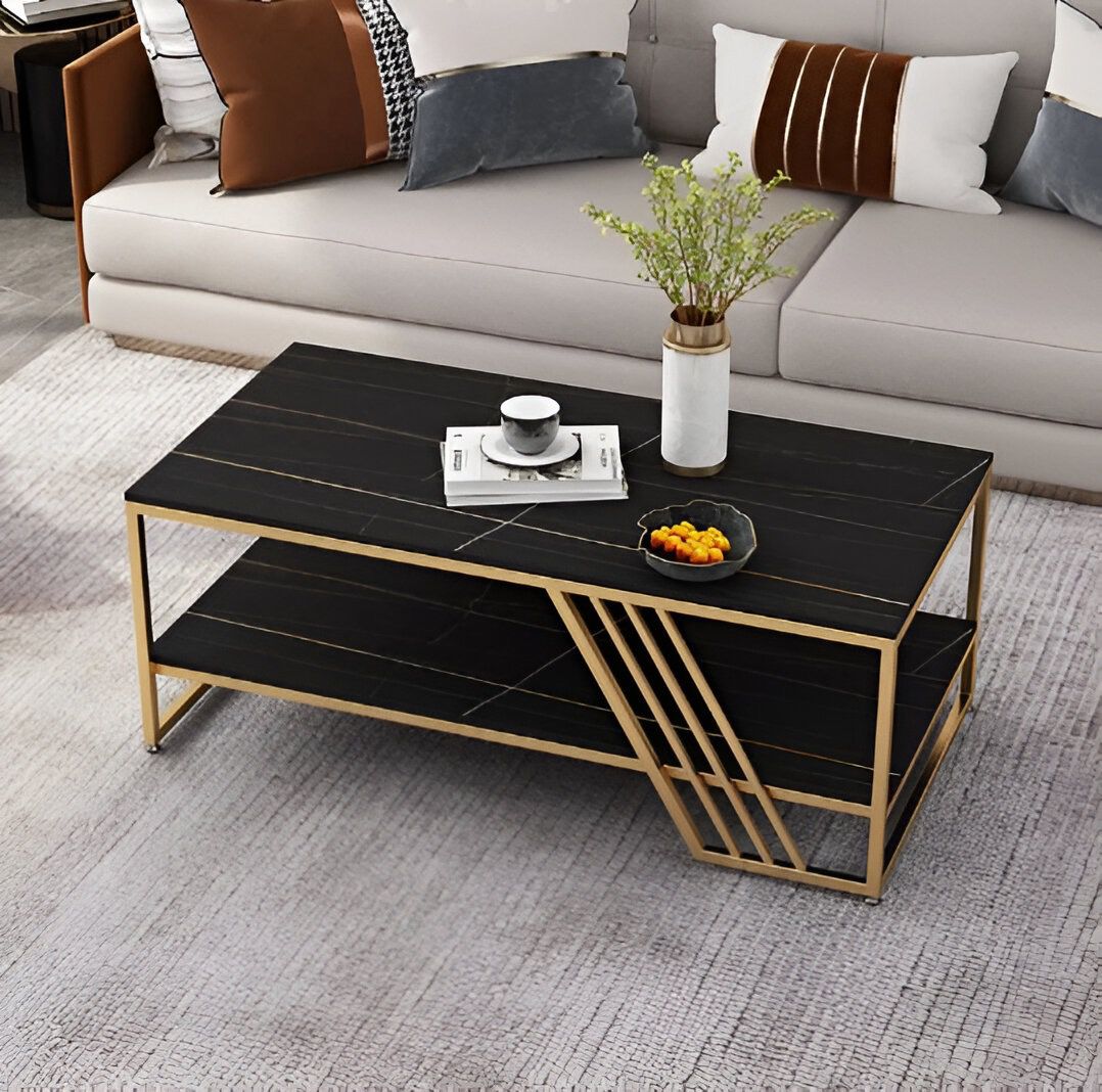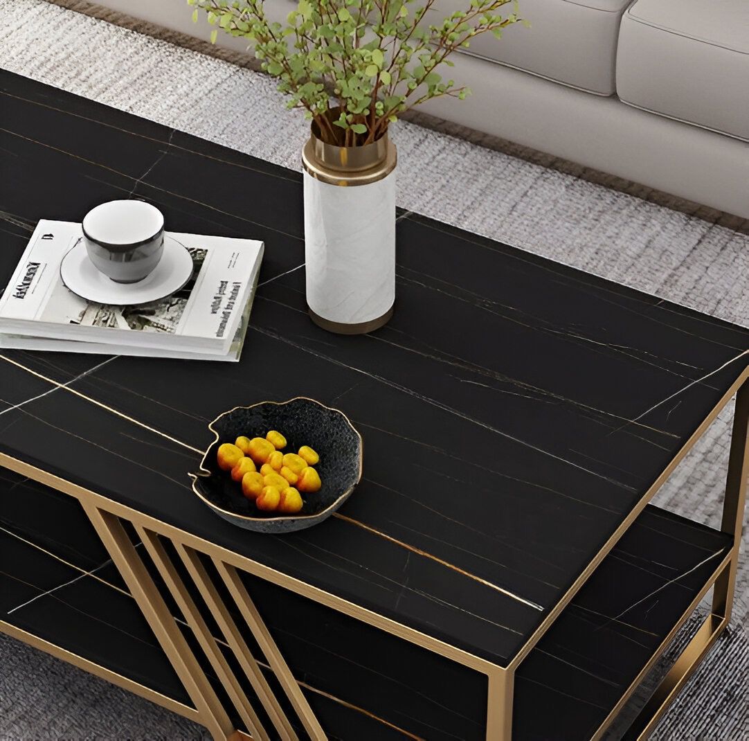 Crno-zlatni stolić unosi sofisticiran izgled u svaki prostor. Crna ploha s diskretnim linijama daje profinjen karakter, dok zlatni metalni okvir dodaje eleganciju i stabilnost. Prikladan je za dnevni boravak, lounge prostore ili moderne poslovne interijere.