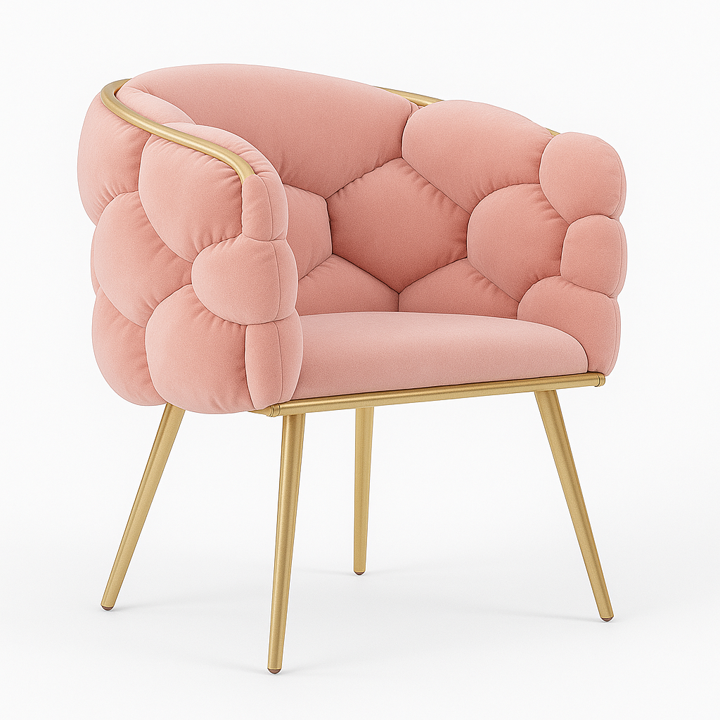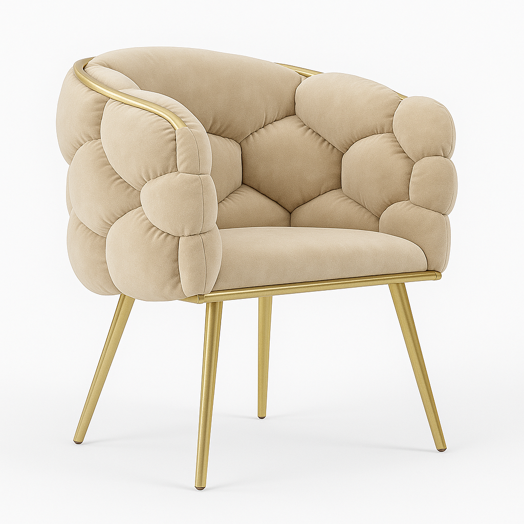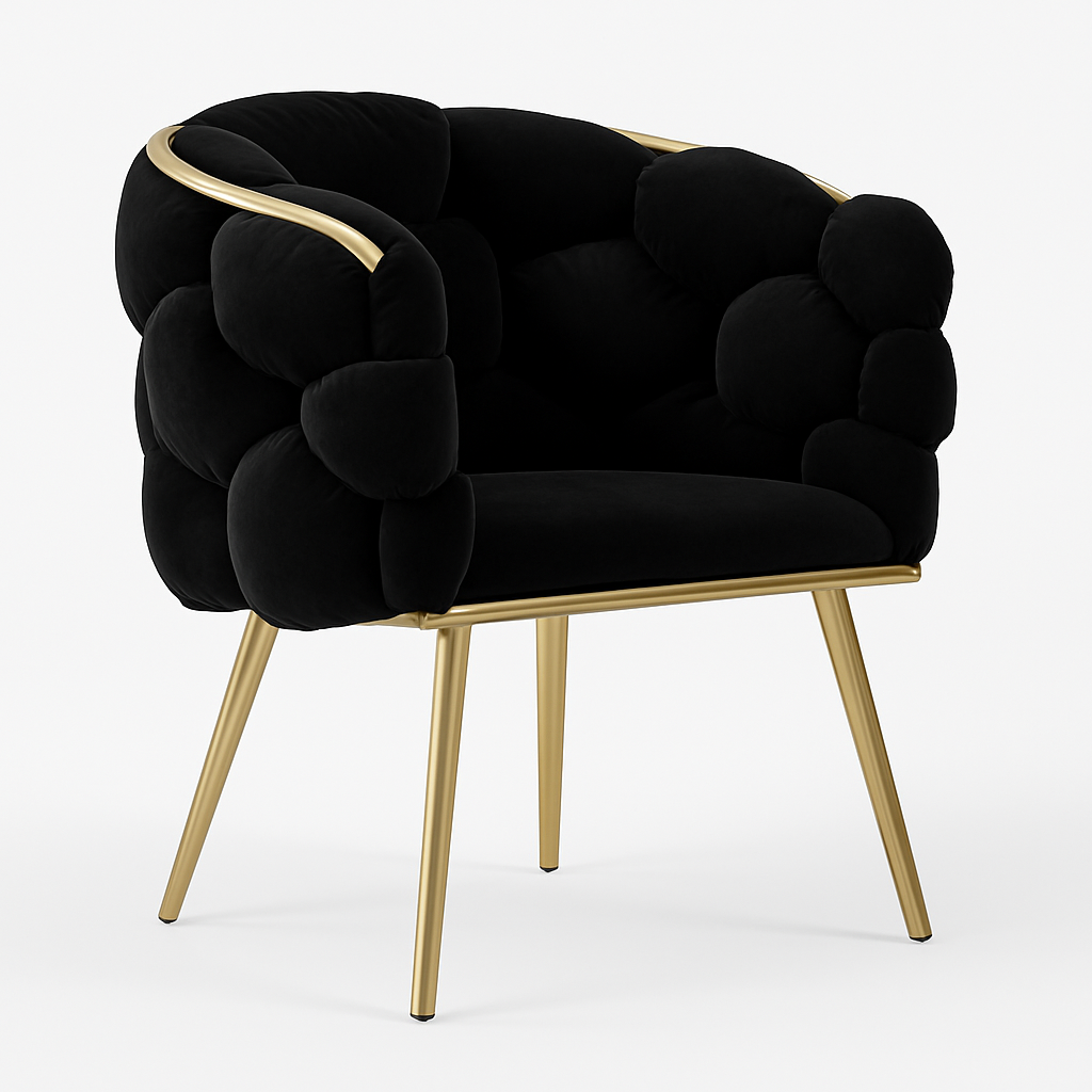 Ova elegantna bubble stolica donosi savršenu kombinaciju mekog baršuna, udobnog pufastog dizajna i zlatnog metalnog postolja koje prostoru daje dozu luksuza.