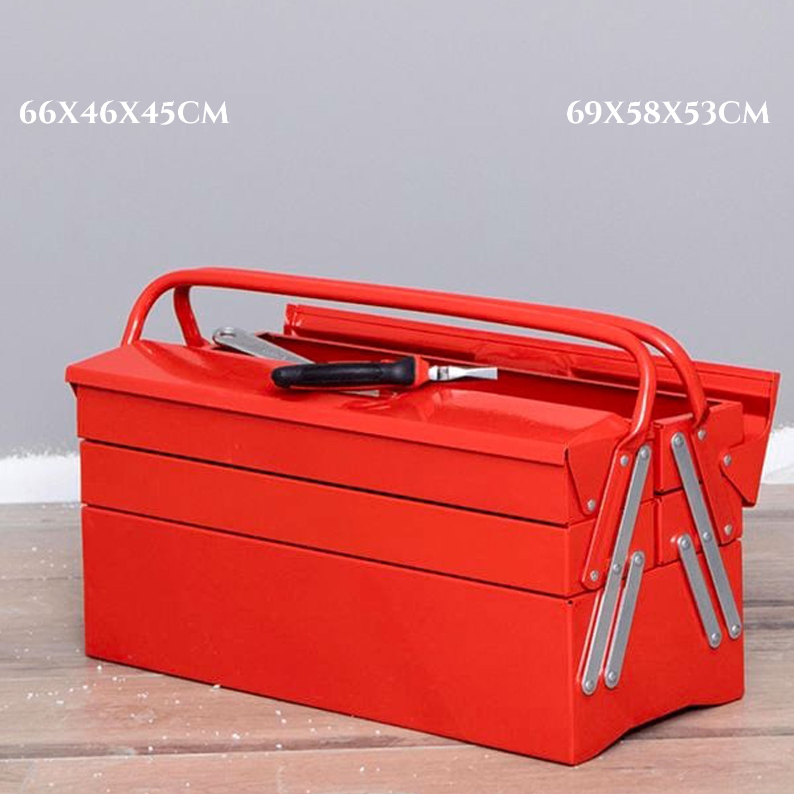 Praktična i robusna metalna kutija za alat dizajnirana za organizirano pohranjivanje alata. Sklopivi višeslojni sustav omogućuje brz pristup svim alatima i maksimalnu preglednost.