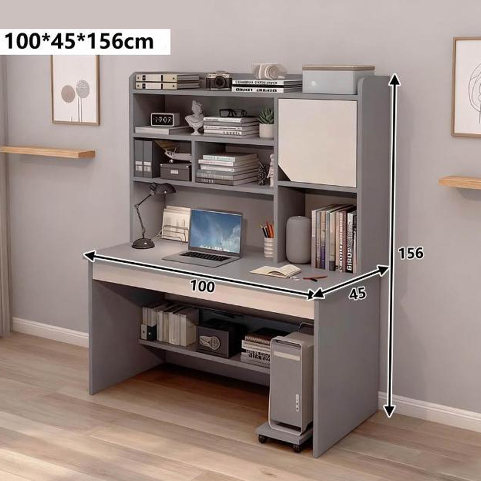 - Pametan raspored: prostor za laptop, bilježnice i dodatke, uz police za knjige i kutije.